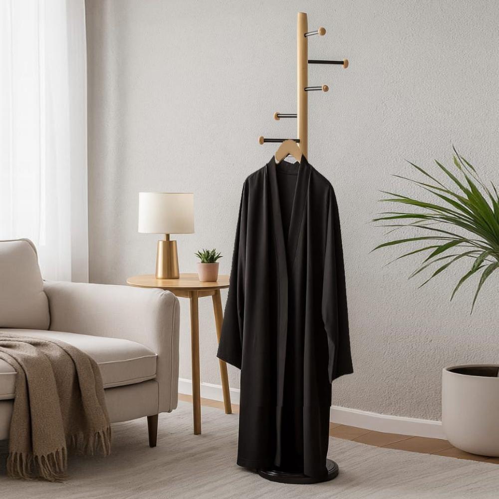 شماعة أرضية أنيقة وعملية بتصميم عصري، مصنوعة من معدن متين مطلي مقاوم للصدأ، مزودة بعدة خطافات لتوفير مساحة تخزين مثالية للملابس والحقائب. مثالية لغرف النوم، المداخل، أو المكاتب.