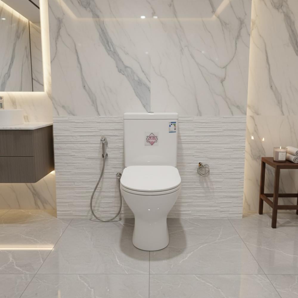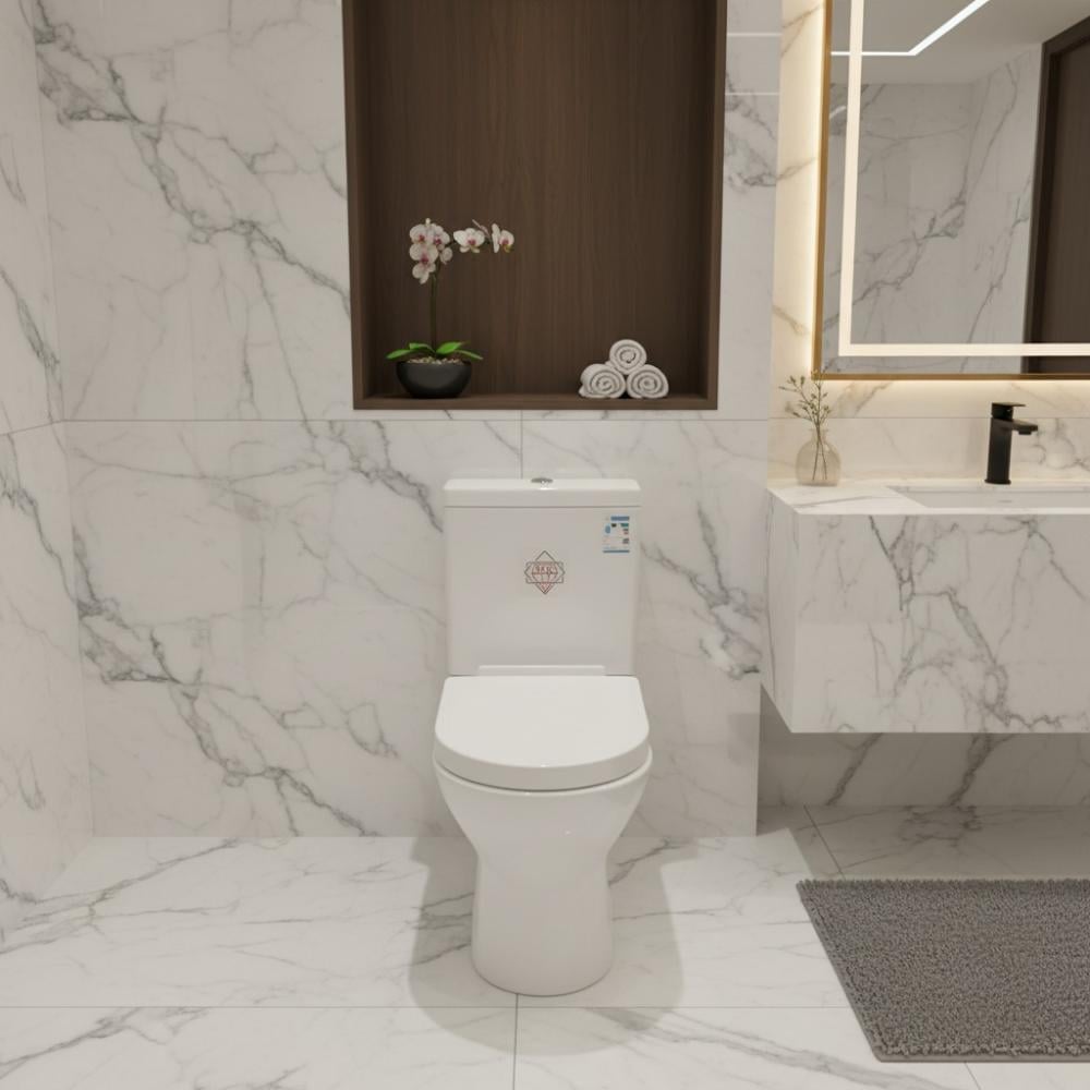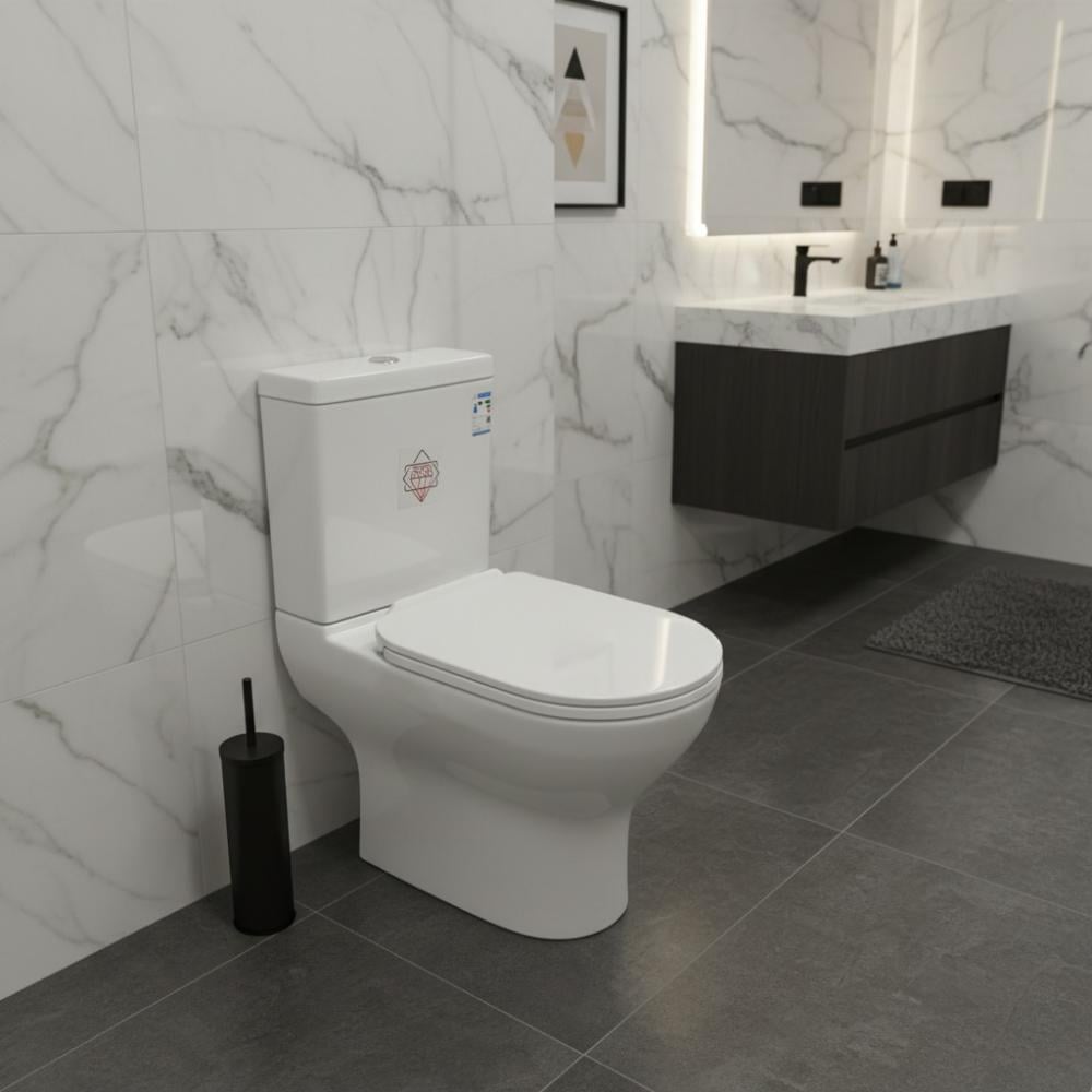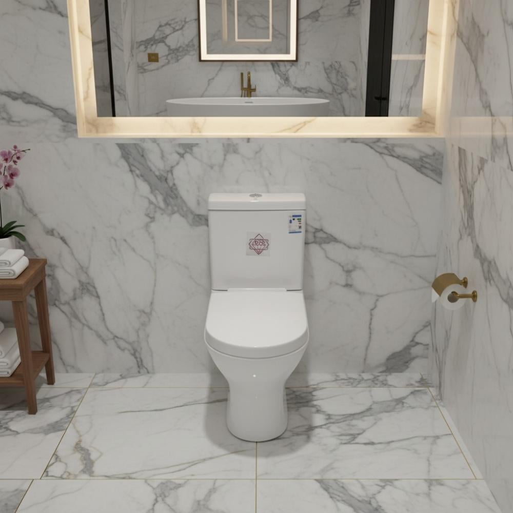 - النوع: مرحاض أفرنجي متكامل (قطعة واحدة) بتصميم كلاسيكي-عصري.
