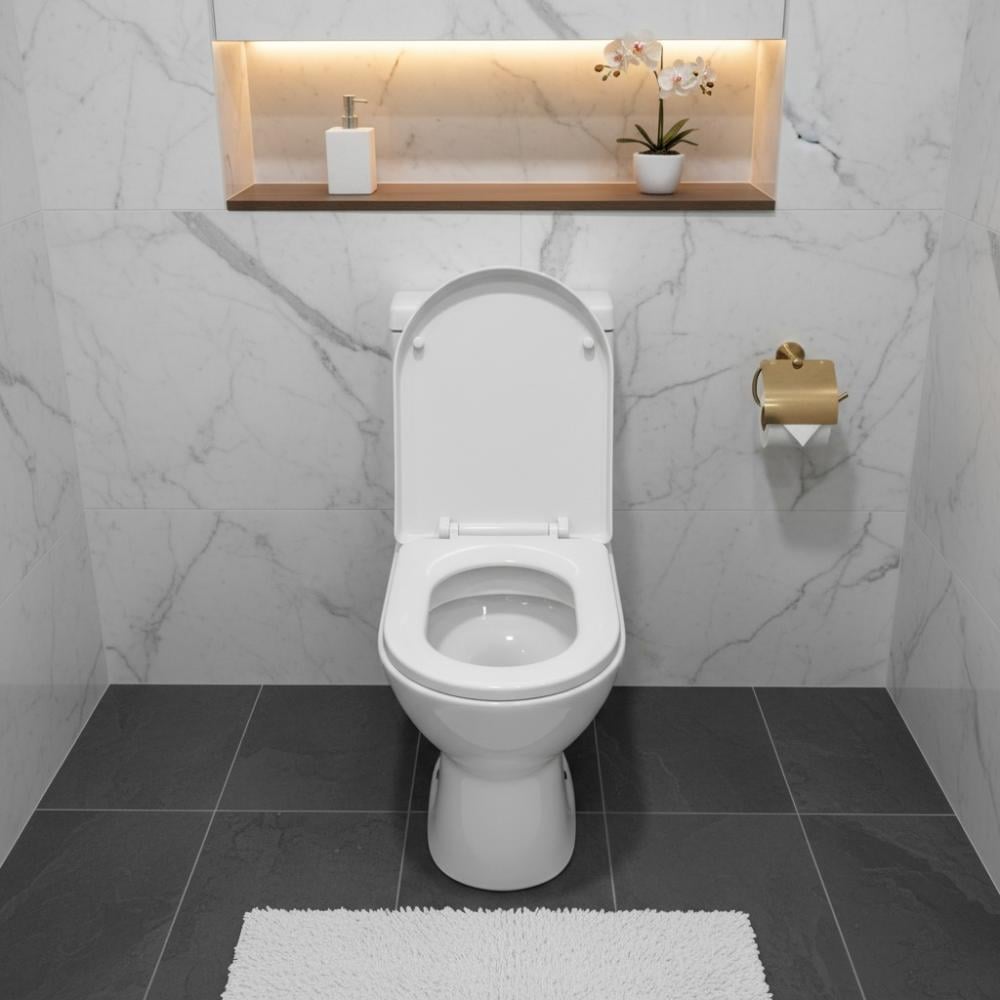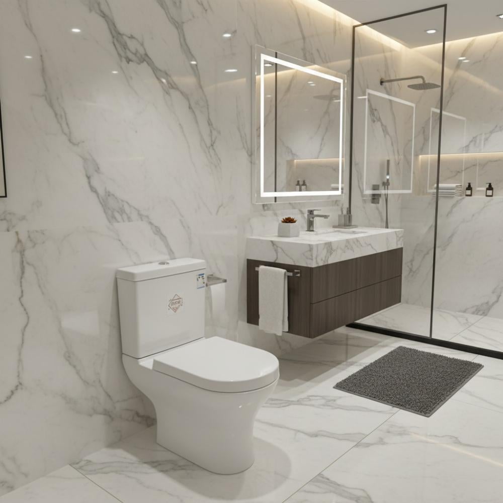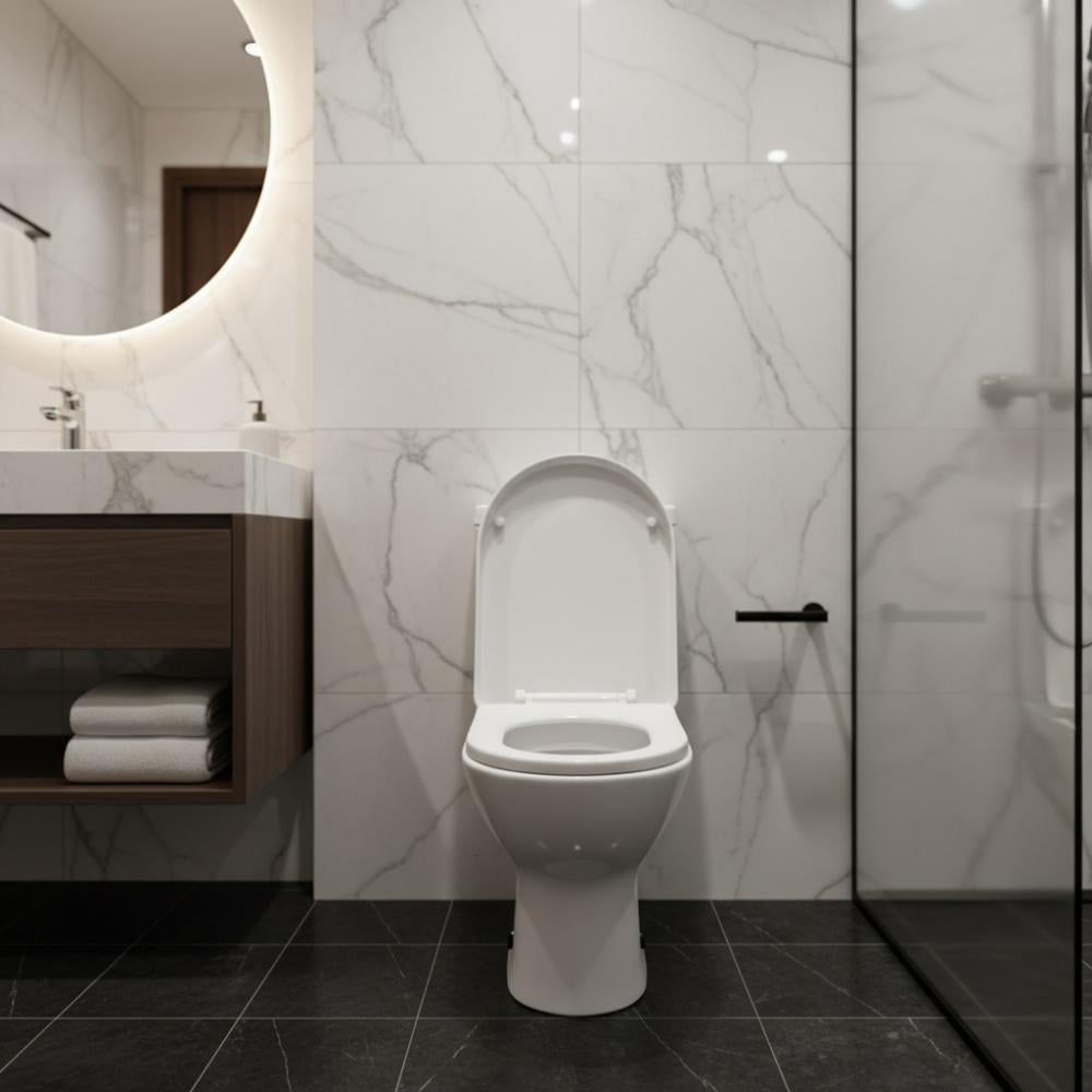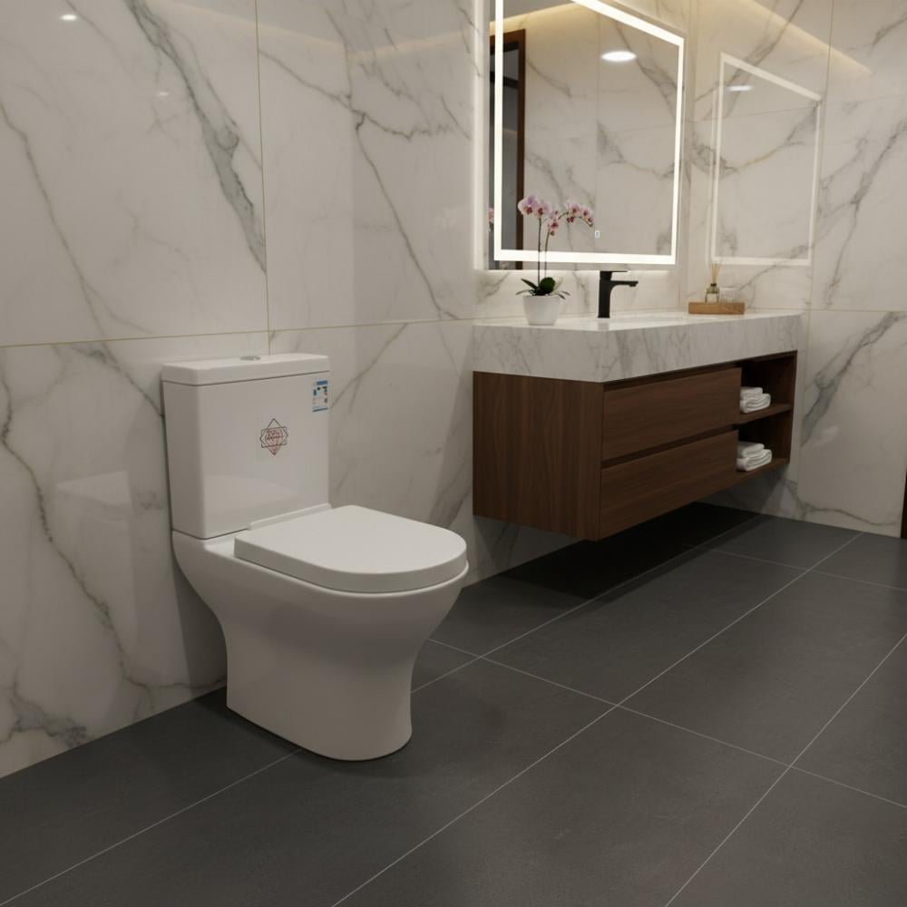 - النوع: مرحاض أفرنجي متكامل (قطعة واحدة) بتصميم كلاسيكي-عصري.